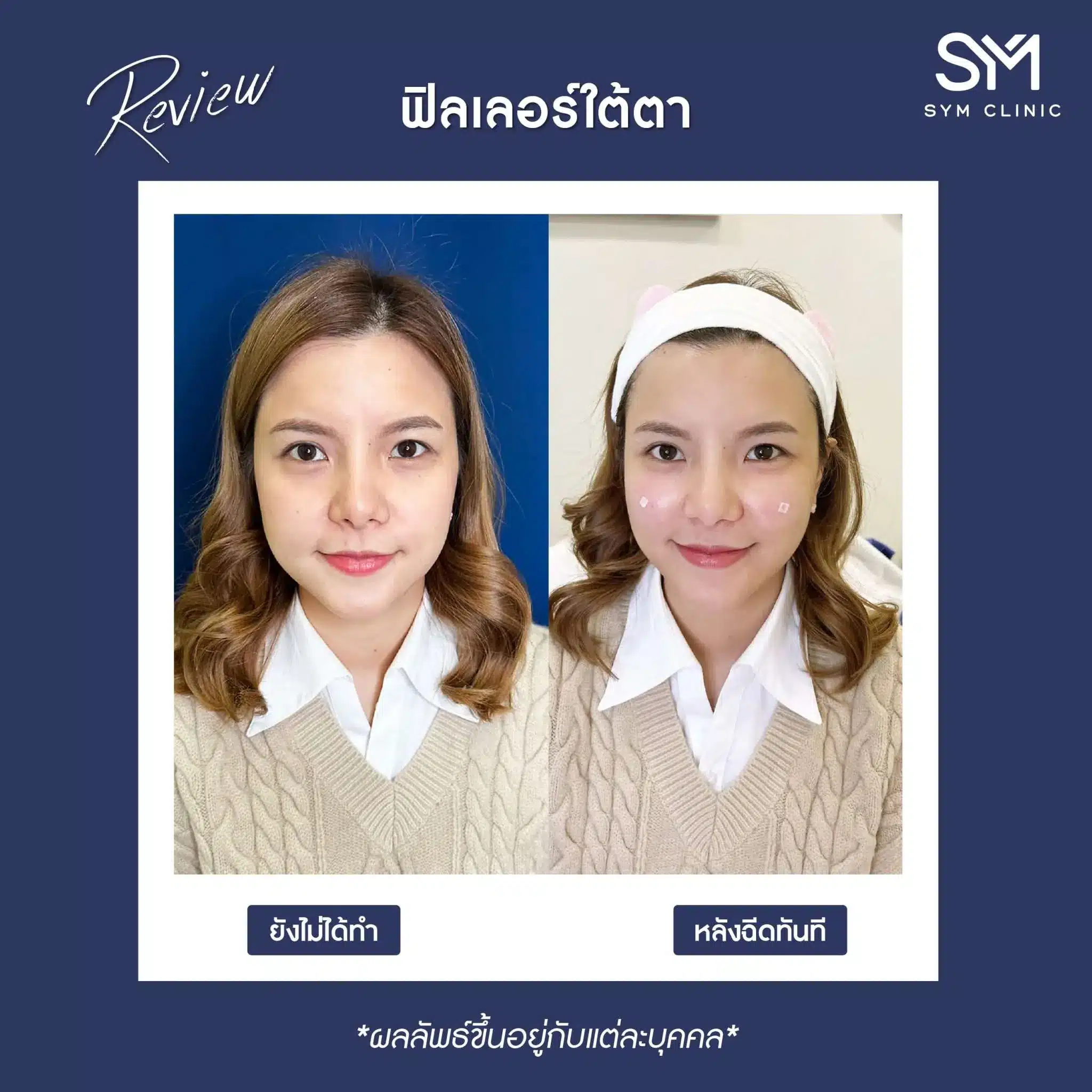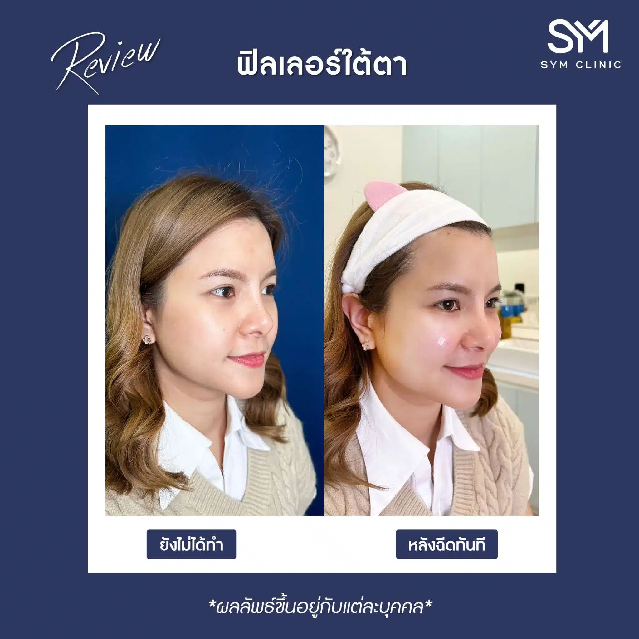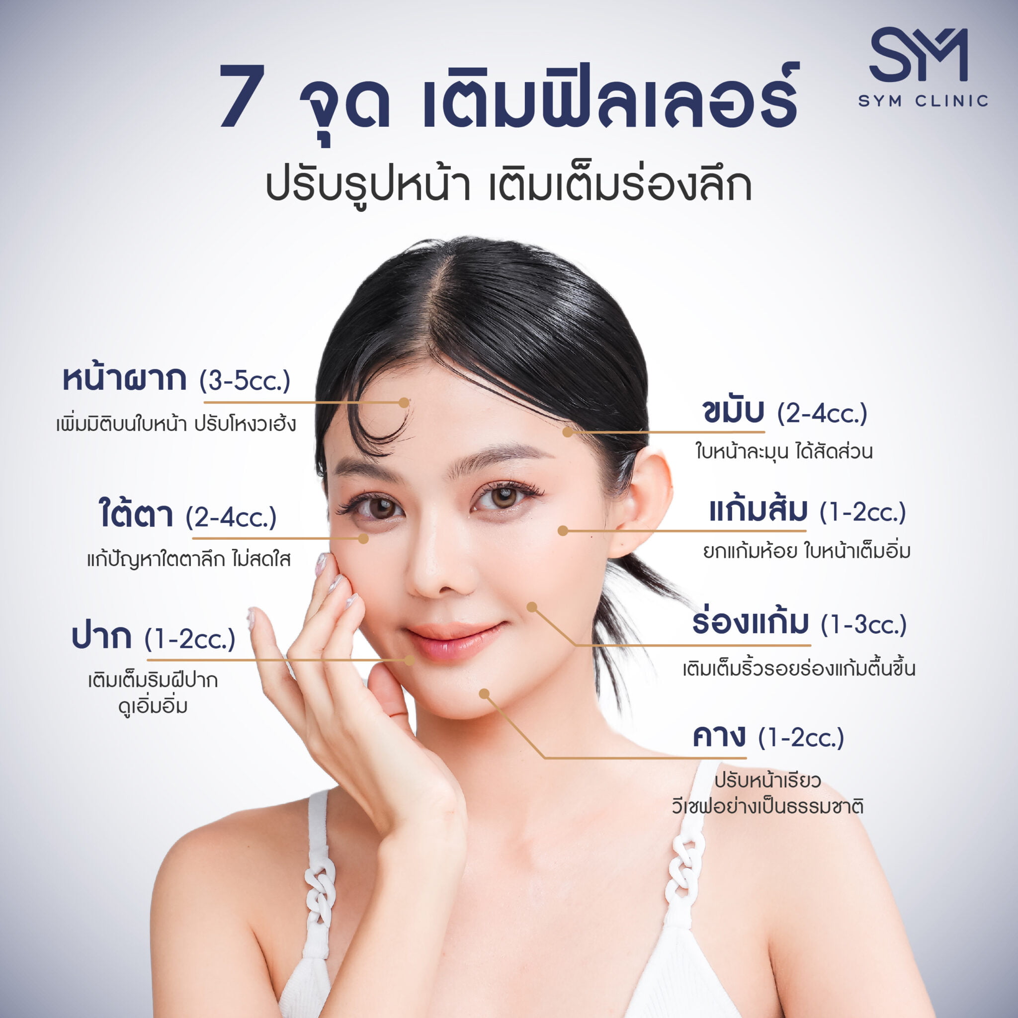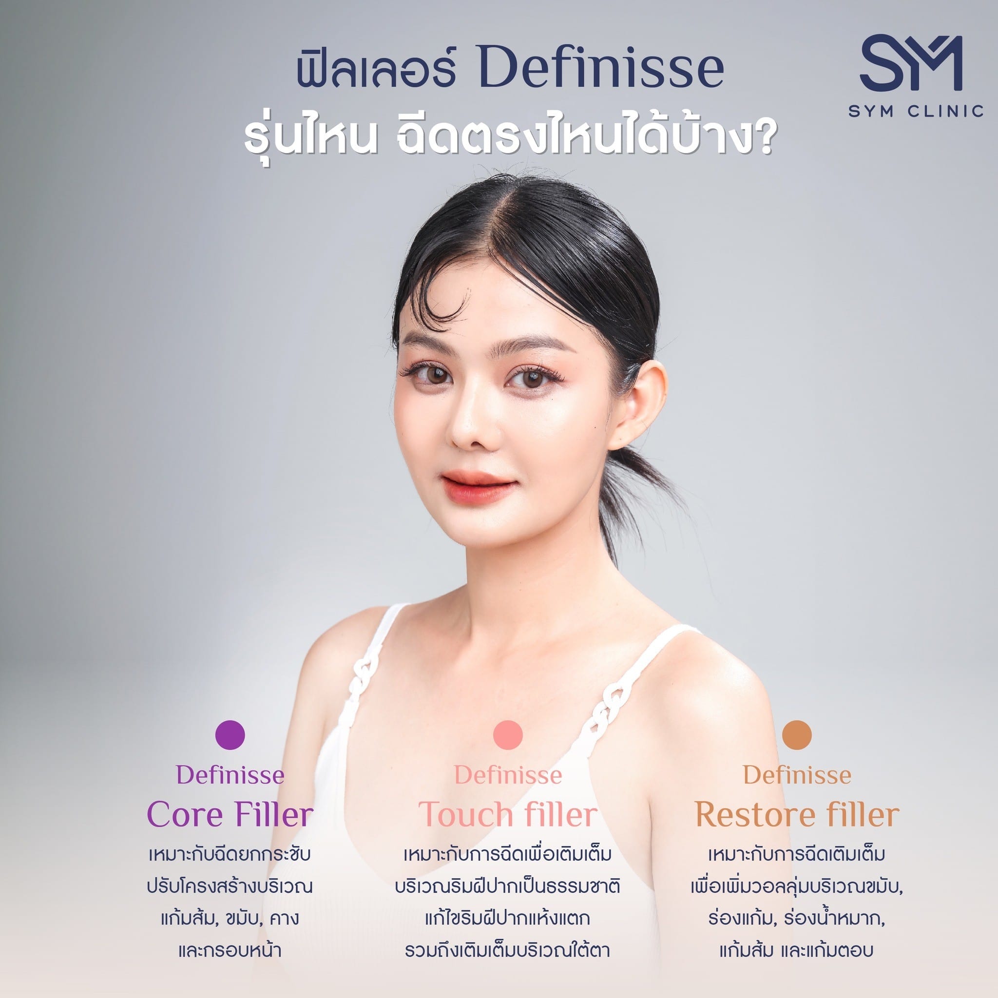 ตอนนี้โปรแกรมฉีดฟิลเลอร์เป็นที่นิยมมากค่ะ เพราะไม่ต้องพักฟื้น เห็นผลเลยหลังทำ และสามารถเติมเต็มได้ทุกส่วนบนใบหน้า ที่ SYM Clinic เราใช้สารเติมเต็ม ที่ได้มาตรฐาน รวมถึงคุณหมอมีประสบการณ์การรักษาหลากหลายเคส และพัฒนาเทคนิคใหม่สม่ำเสมอ เพื่อให้ลูกค้าได้รับสิ่งที่เหมาะสมและดีกับใบหน้าตัวเองกลับไปค่ะ